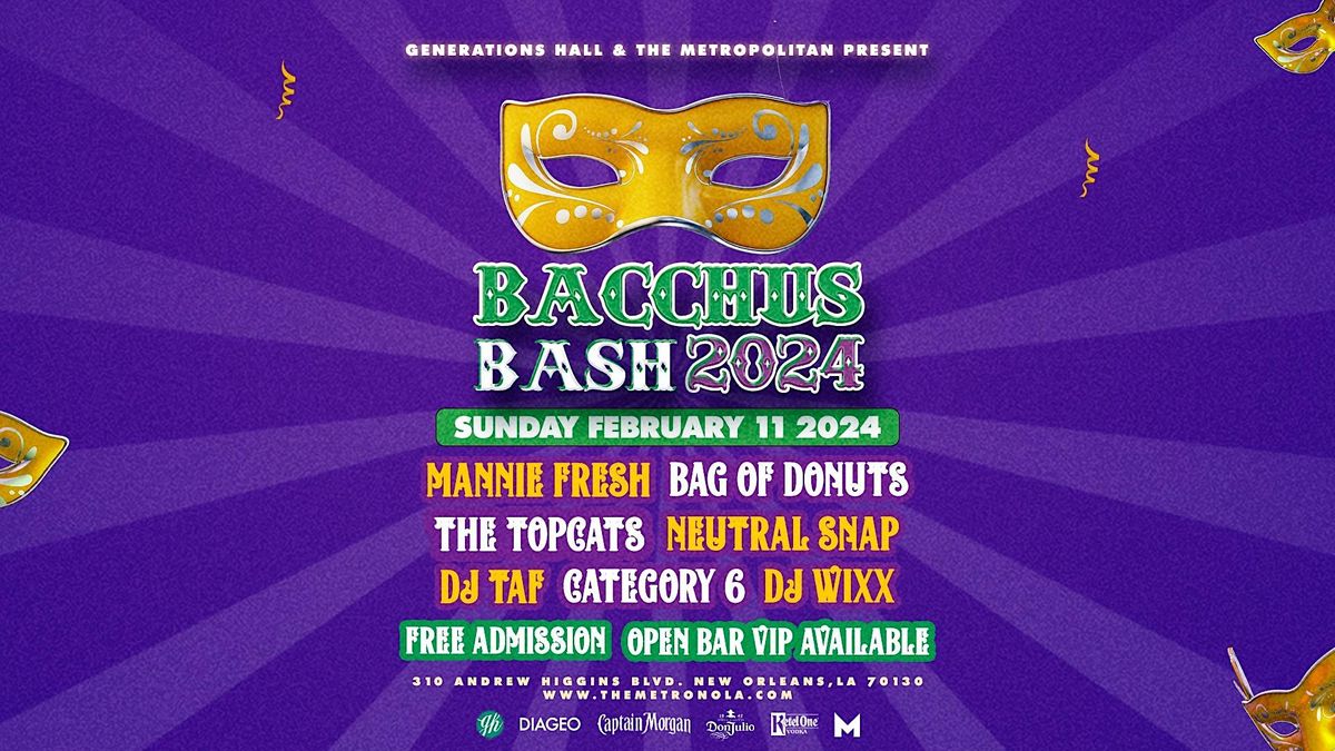 Bacchus Bash 2024 includes a host of live music performances which includes Mannie Fresh, Bag of Donuts, The TopCats, Neutral Snap and Category 6. The popular Mardi Gras tradition that takes place the Sunday before Fat Tuesday is an indoor/outdoor party showcasing several stages, some of the city’s best local bands and great drink specials. This year’s Bacchus Bash also features DJ Mannie Fresh, DJ Wixx and DJ TAF.