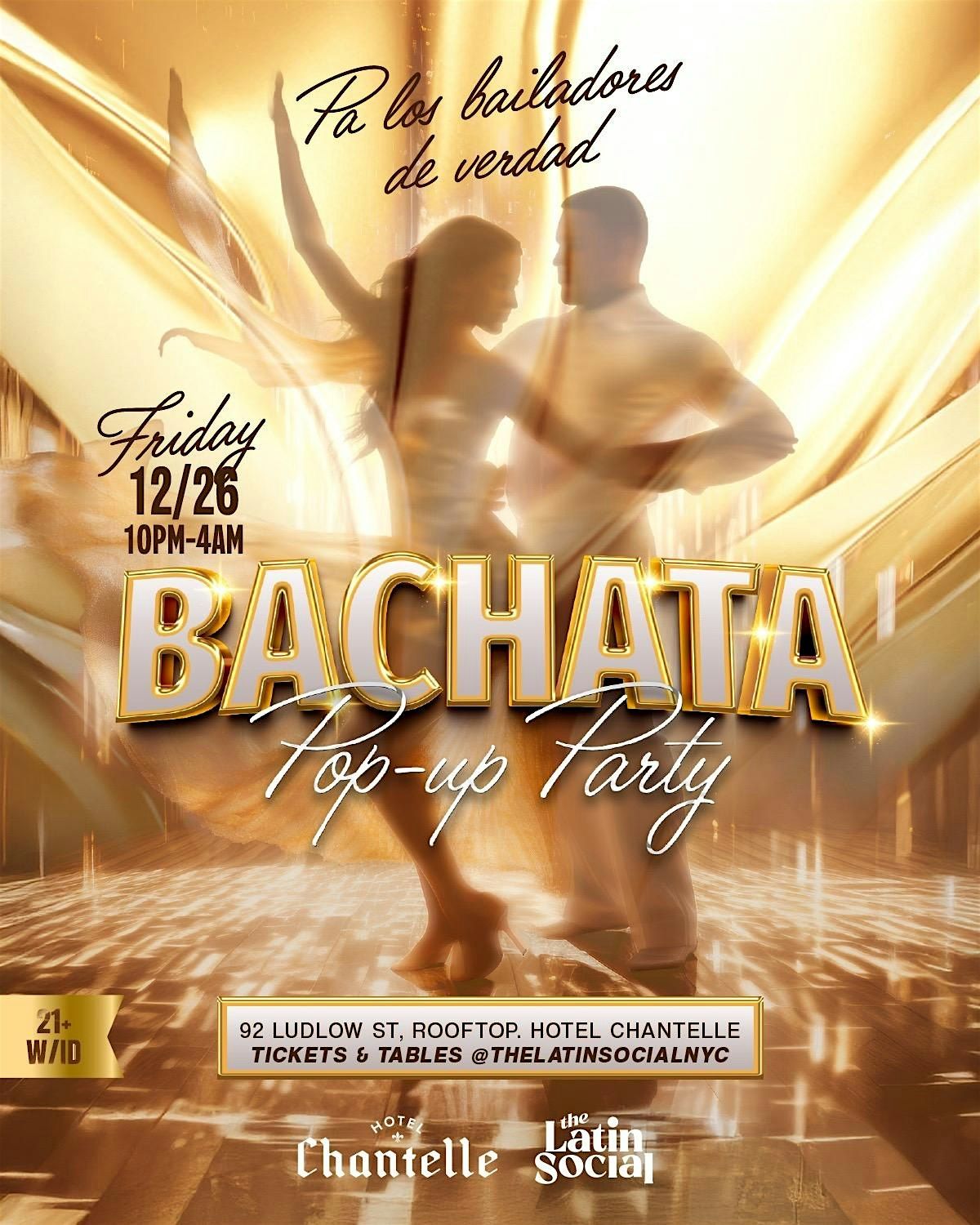 Pa’ los bailadores de verdad. Join us for a special Bachata Pop-Up Party at Hotel Chantelle in the Lower East Side, featuring traditional bachata dancing and authentic Latin vibes.