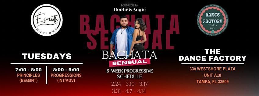 Ready to level up your bachata the right way? Join Ésmooth Motions every Tuesday at The Dance Factory (Tampa) for our 6-week progressive Bachata Sensual program—with Principles (Level 1) & Progressions (Level 2) running side-by-side from 7:00–9:00 PM.