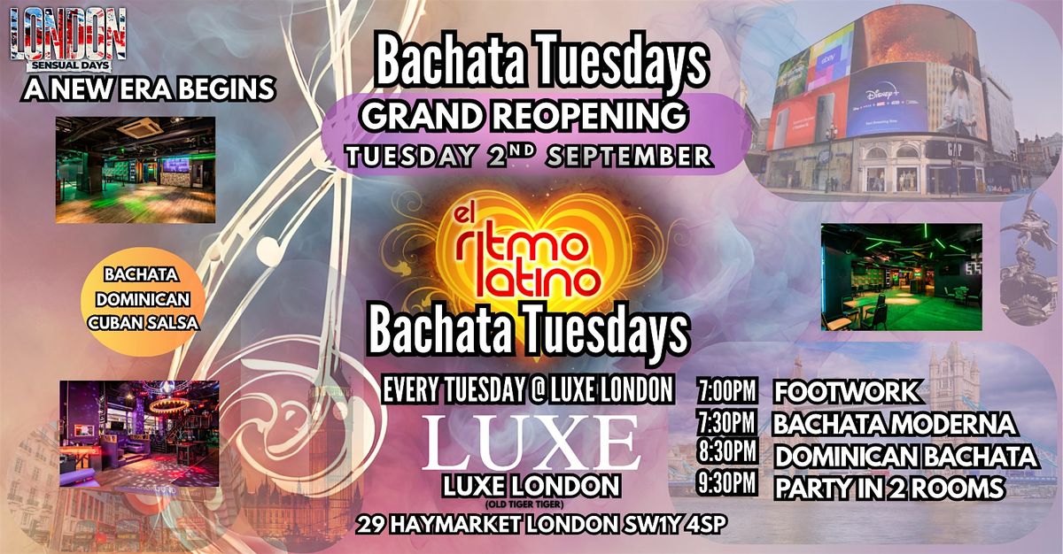 Bachata Tuesdays is London’s longest-running weekly Bachata night, now in its new home at LUXE LONDON (Old Tiger Tiger), 29 Haymarket, London SW1Y 4SP