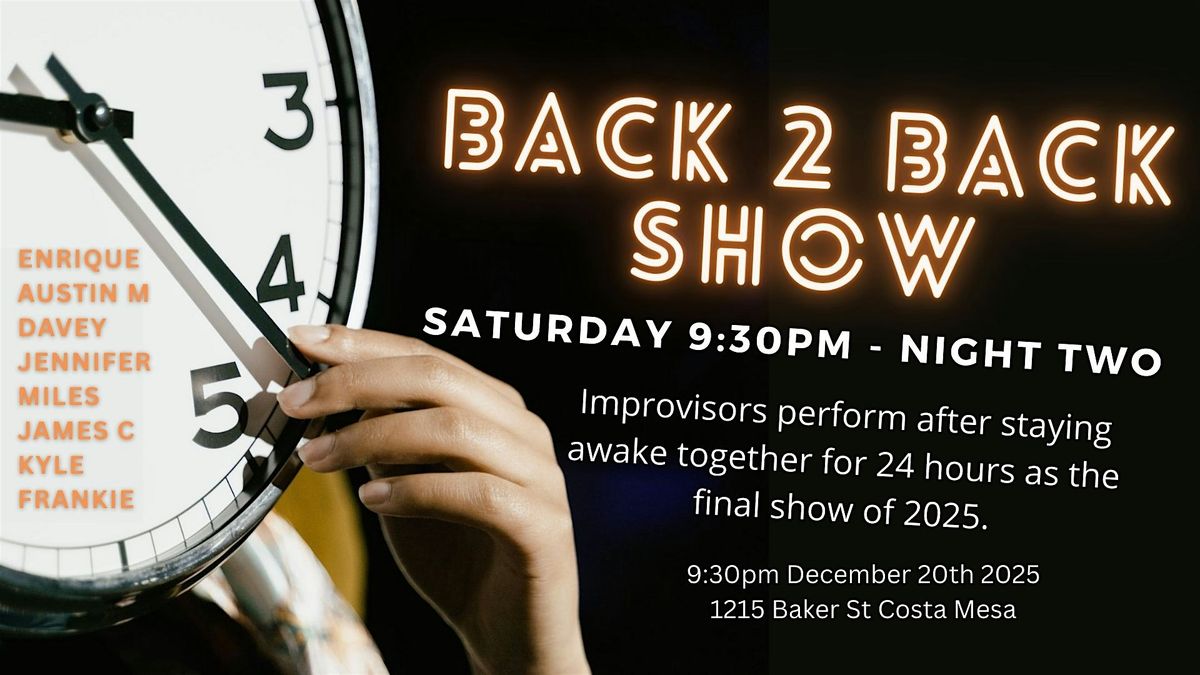 We invite you to the traditional Improv Collective year-closing show: The Back to Back Show. A show which no one should do, yet somehow happens year after year. Improvisers perform together in a Friday night 9:30pm show, then STAY UP TOGETHER FOR 24 HRS, and return to perform the same set-list Saturday night at 9:30pm. Can you believe 8 performers agreed to this? The least you can do is come witness their bad decisions.