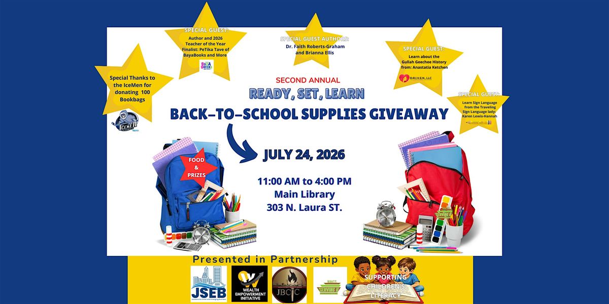 Join us for the Second Annual Ready, Set, Learn: Back-to-School Supplies Giveaway on July 24, 2026, from 11:00 AM to 4:00 PM at the Main Library (303 N. Laura St.). This community-centered event is designed to equip students with essential school supplies while bringing families together for a day of learning, connection, and fun.