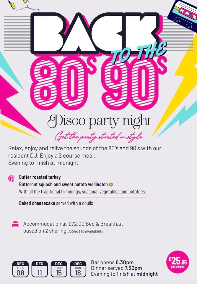 Relax, enjoy and relive the sounds of the 80’s and 90’s with our resident DJ. Enjoy a 2 course meal.Evening to finish at midnight, just £25.95 per person.