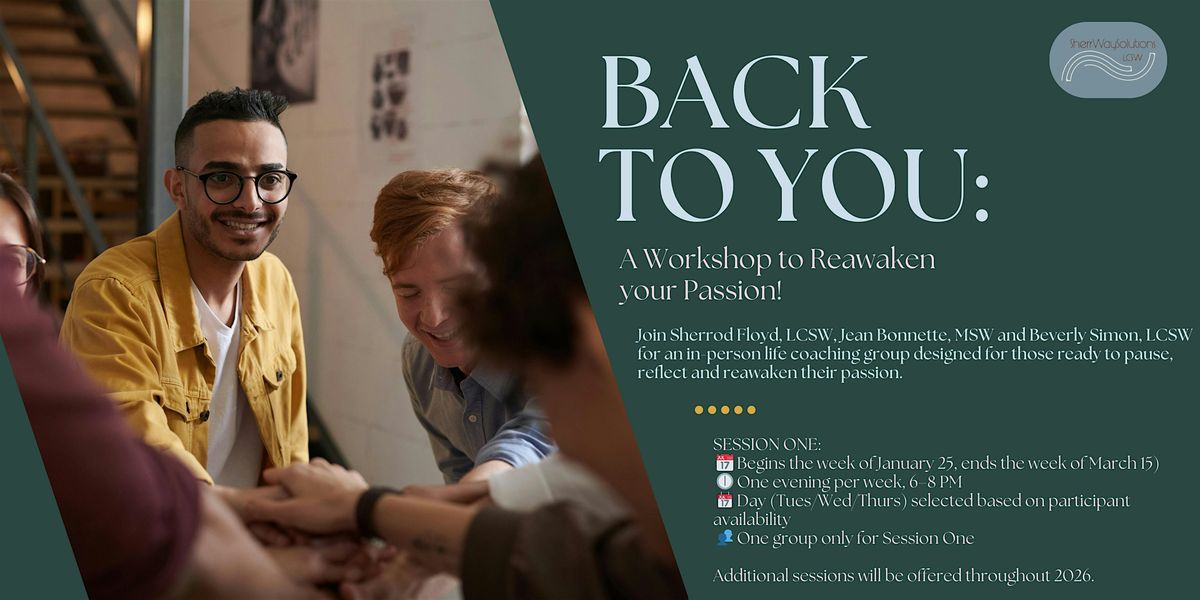 Back to You is an 8-week life coaching group designed for individuals navigating life transitions, personal growth, and rediscovery. This group offers a supportive space to pause, reflect, and realign with intention.Join Sherrod Floyd, LCSW, CEAP, Beverly Simon, LCSW, C-ASWCM and Jean Bonnette, MSW, CPCC for an in-person life coaching workshop designed for those ready to pause, reflect, and realign.