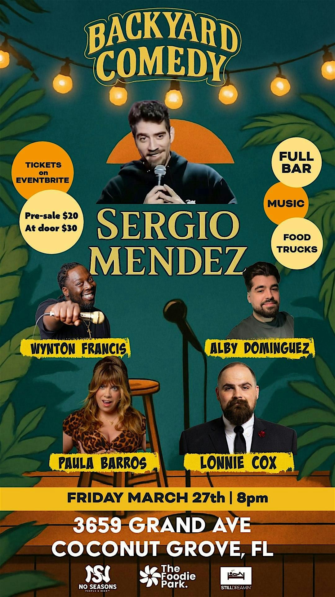 Backyard Comedy presents Sergio Mendez & friends at Foodie Park in Coconut Grove. Casual dress code. Full bar. Craft Beer by No Seasons brewery. 21+. Doors at 8pm. Pre-sale tickets $20, $30 at the door. Show starts at 9:30pm sharp. Music and food trucks on site. Smoke friendly environment. FREE Trolly drop off to cars after show. VIP sections with bottle service available. To reserve please text 786-424-9694