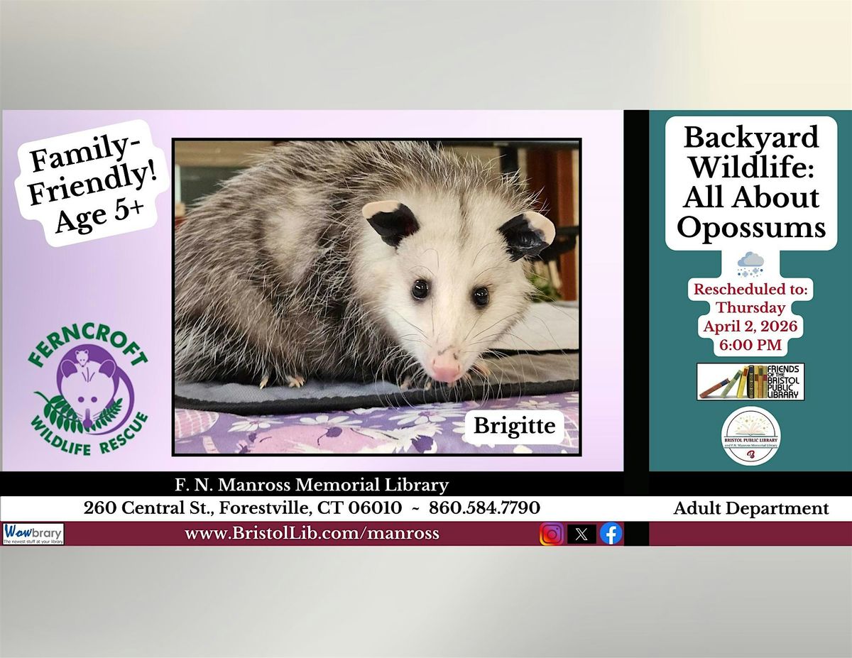 Learn all about opossums, a gentle, backyard animal that is largely misunderstood. Topics will include their development from birth to adulthood, their rehabilitation, and how they can peacefully coexist with people. Ferncroft Wildlife Rescue will bring their ambassador opossums! Family-friendly for ages 5+. Please register. Manross Library #860-584-7790. (Rescheduled from February date.)