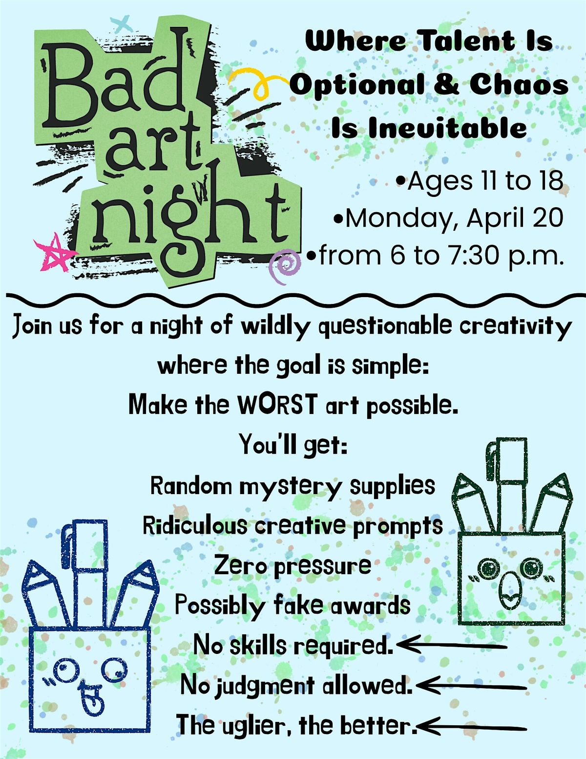 At Bad Art Night, the goal isn’t to create something beautiful—it’s to make the worst art possible. Participants will receive random mystery supplies and ridiculous creative prompts to inspire their intentionally awful masterpieces.