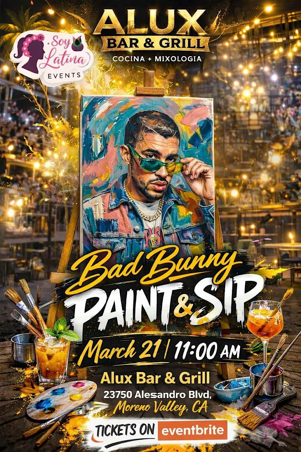 Get ready for a fun and chill Paint & Sip session inspired by Bad Bunny vibes! Join us at Alux Cocina + Mixologia on March 21, 2026 at 11:00 AM (Pacific Time). Whether you’re a pro or just want to have a good time, this event is all about creativity, drinks, and good company. Don’t miss out on this awesome in-person hangout!