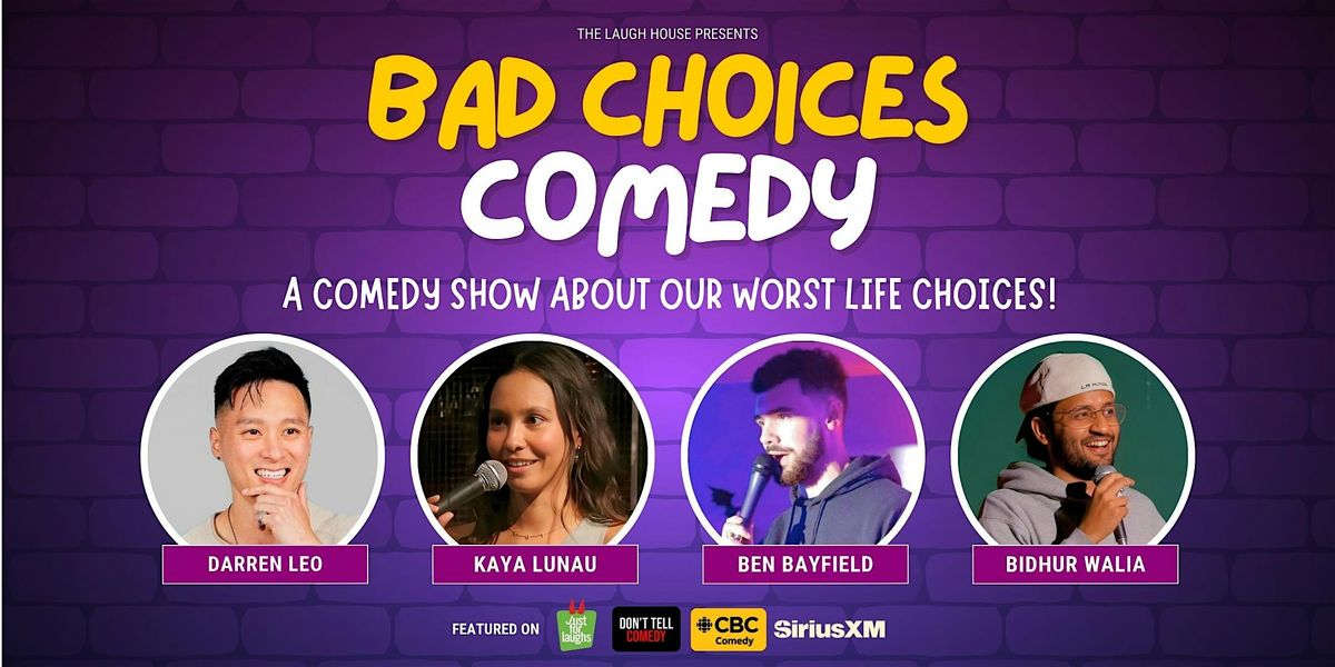 The Laugh House presents BAD CHOICES COMEDY - Toronto's go-to weekend comedy show! The funniest stories start with terrible decisions. Come laugh at comedians exposing their worst life choices!