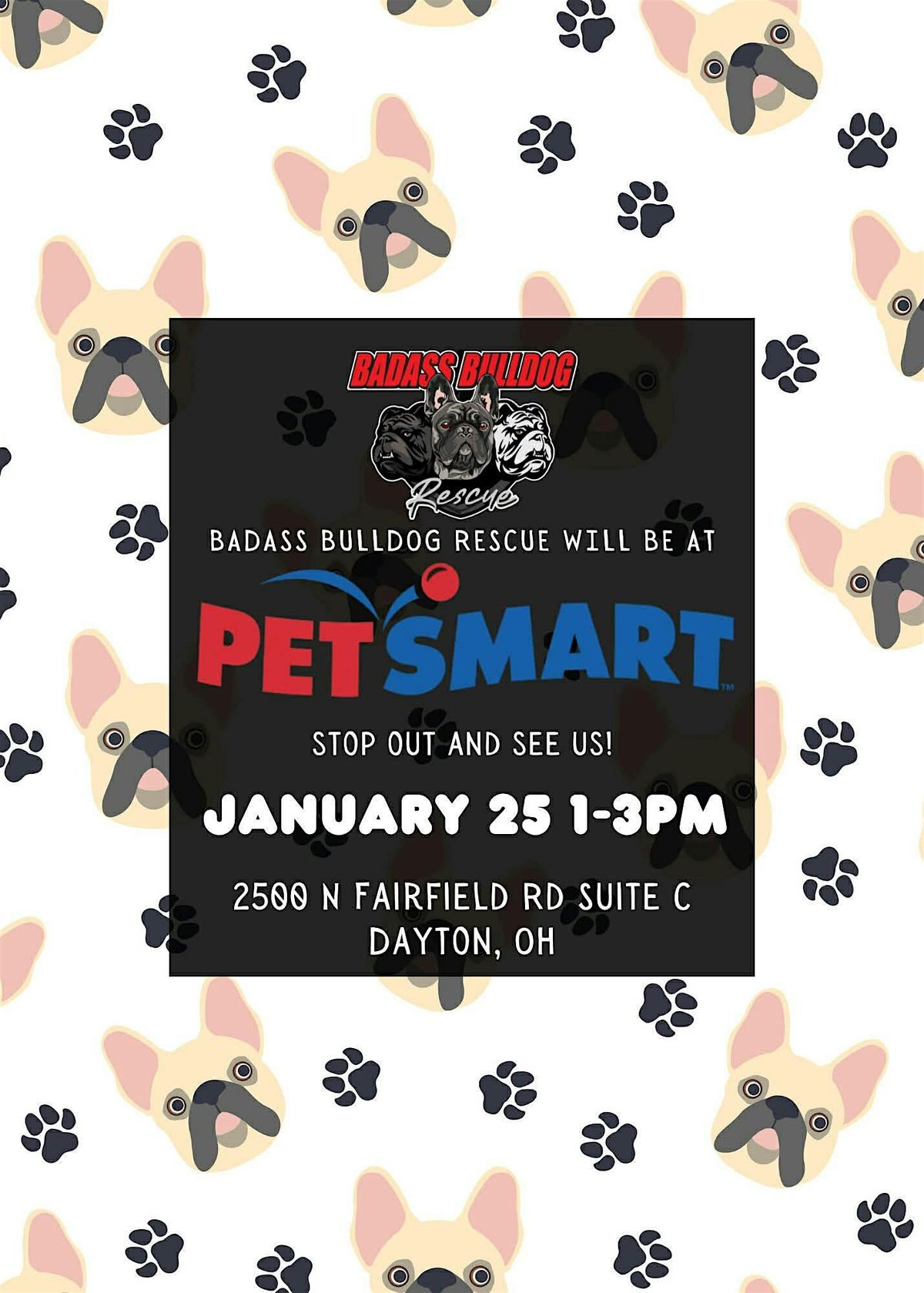 Badass Bulldog Rescue will be at Petsmart in Beavercreek January 25th from 1 to 3pm! Come out & meet some of our adorable pups & maybe buy one of our coloring books or shirts.