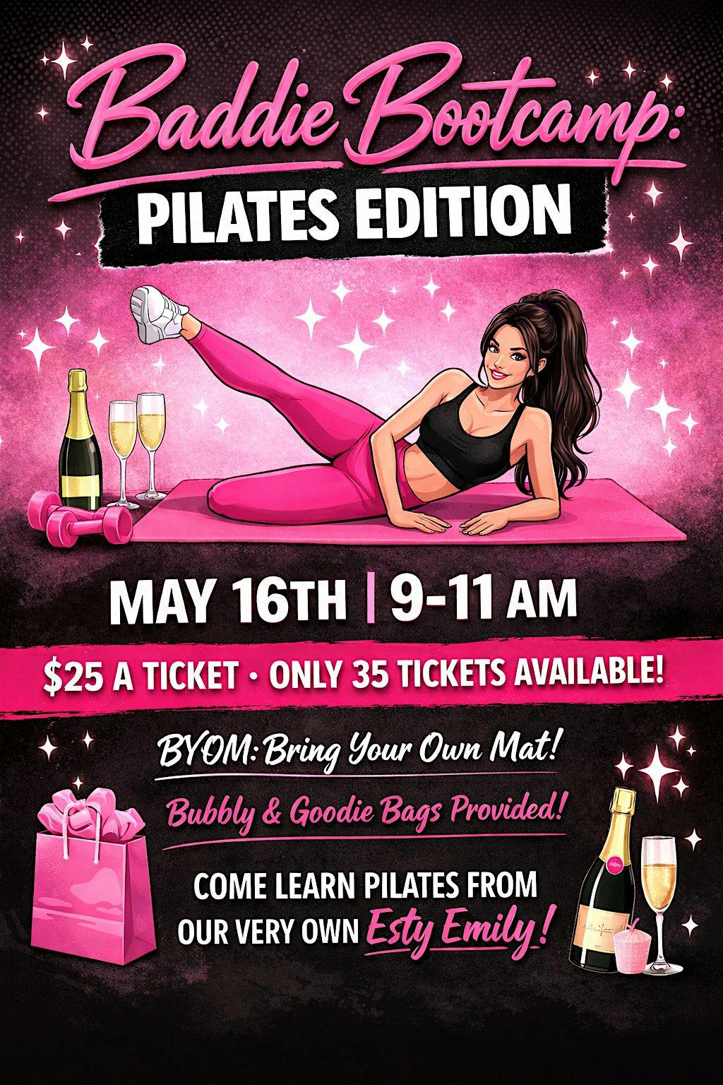 Meet us in the parking lot to soak in the warmer weather! Get ready to sculpt, strengthen, and slay in this in-person Pilates experience. Whether you're a newbie or a pro, this bootcamp will have you feeling fierce and flexible. Join us for a fun, energizing session that'll leave you glowing inside and out. Bring your best vibes and let's make every move count! Esty Em is bringing the moves and all the right vibes for your Pilates experience! Make it fun, make it bubbly make it a true baddie experience!