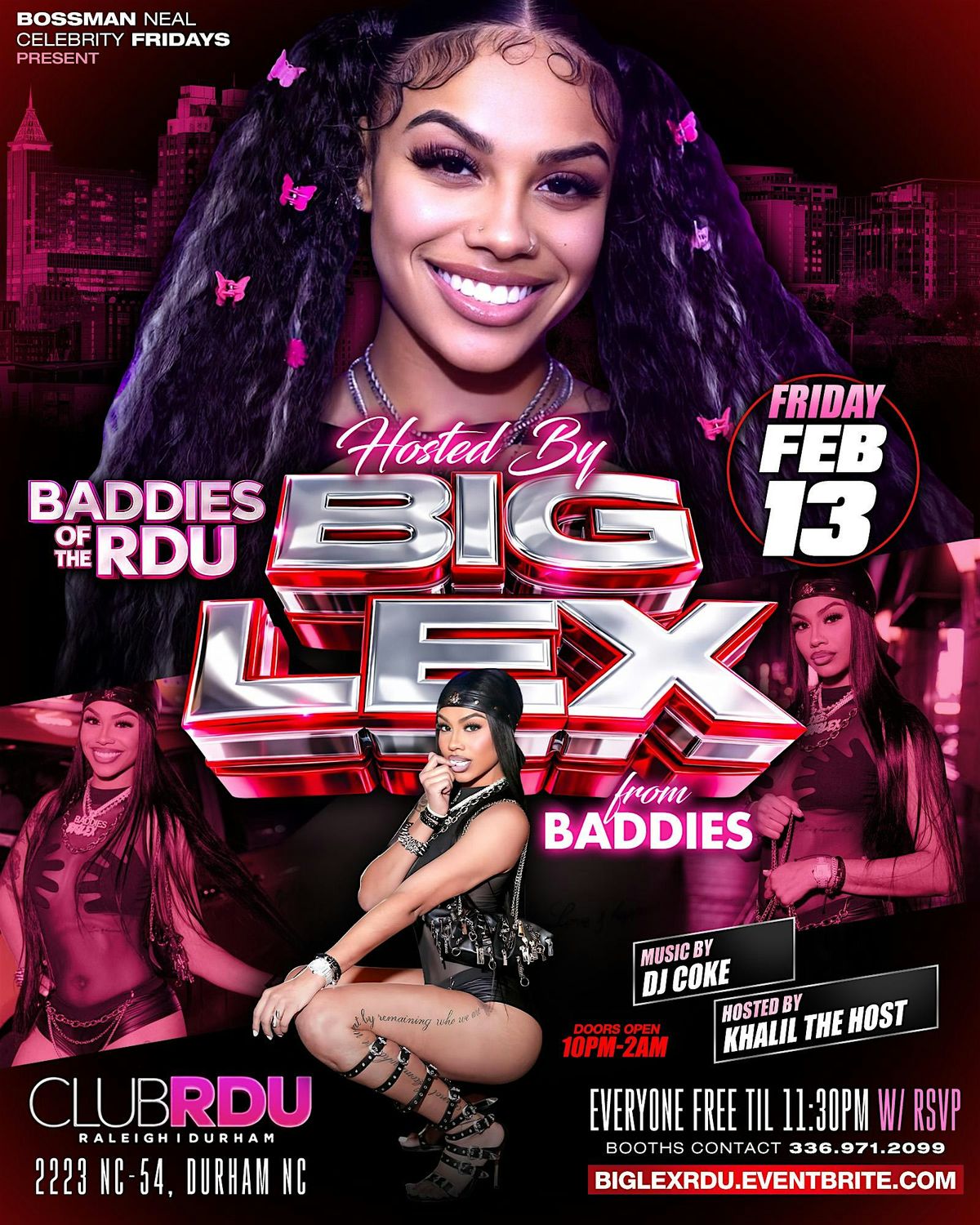 #1 CELEBRITY FRIDAY LOCATION IN THE DURHAM/ RALEIGH AREA. FEATURING BIG LEX FROM BADDIES & ZEUS NETWORK. EVERYONE FREE TIL 11:30 W/ RSVP