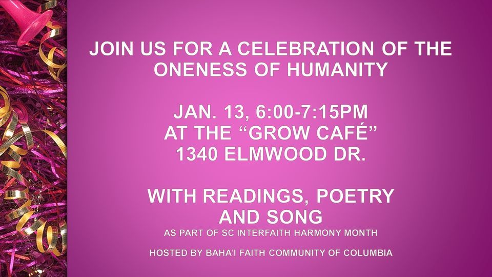 "Celebration of the oneness of humanity" with readings, poetry, and song. By "oneness" we mean unity in diversity, of the beautiful flower garden of humanity. We hope many of you will join us.