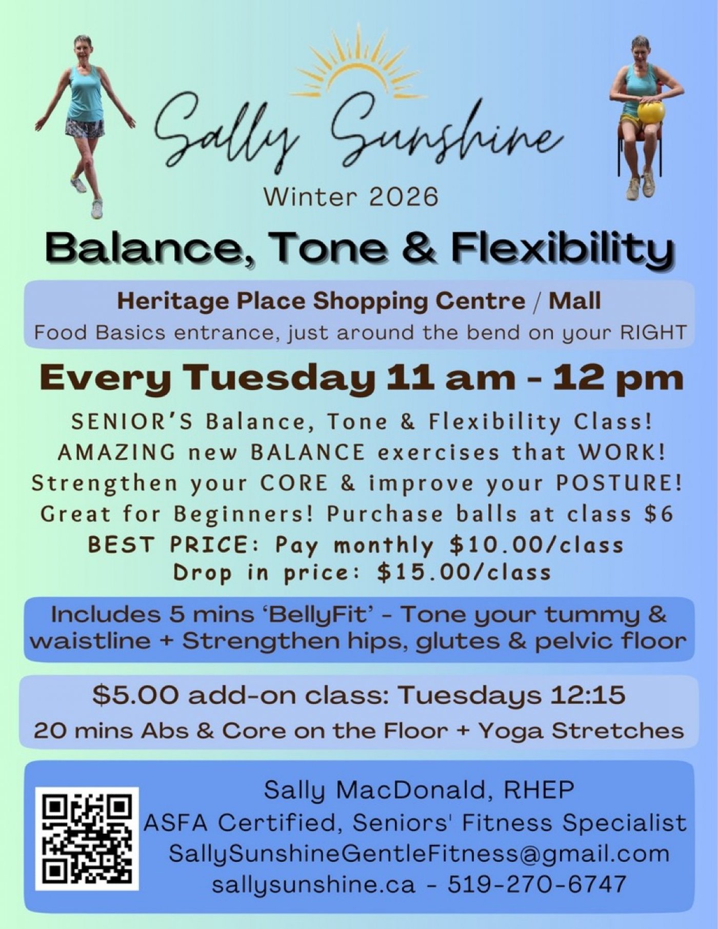 My Seniors’ Balance, Tone & Flexibility Class runs every Tuesday from 11:00 am to 12:00 pm at the Owen Sound Heritage Place Shopping Centre (Mall), located near the Food Basics entrance — just around the bend on your right.