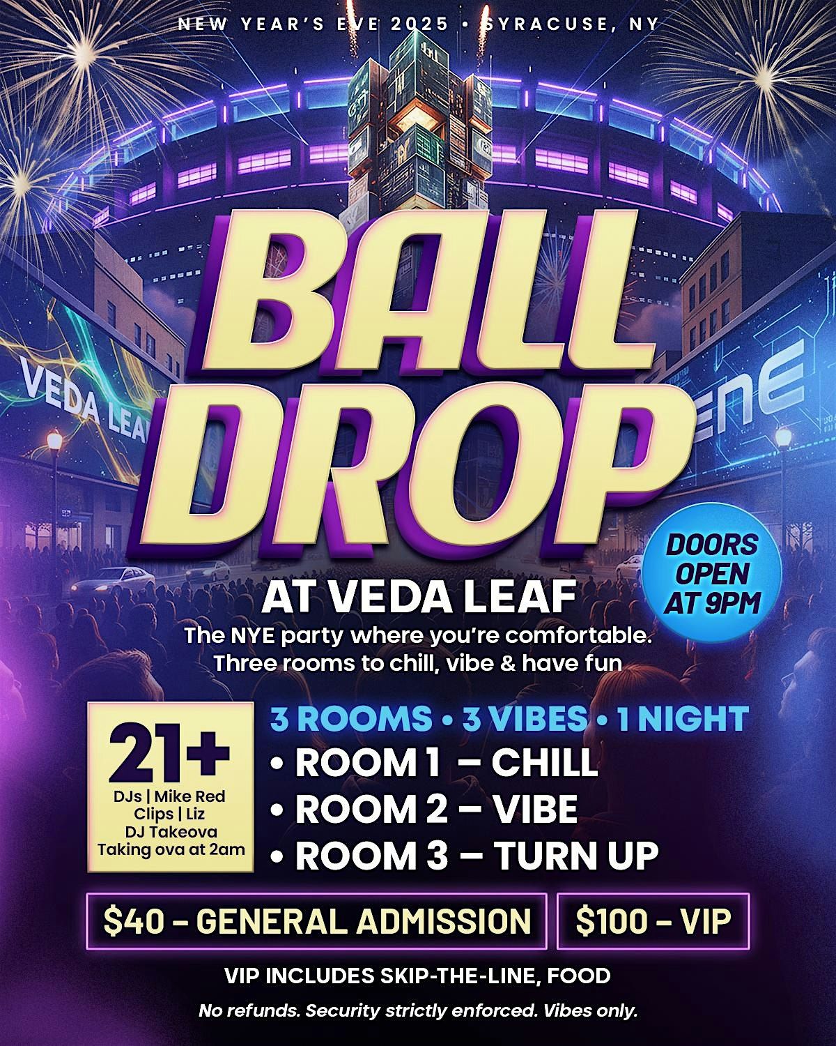 Celebrate New Year’s Eve at Veda Leaf with an upscale 21+ Ball Drop experience. Enjoy top DJs, premium vibes, and a midnight countdown from 9PM–3AM. VIP options available with skip-the-line access, food, and infused experiences. Limited availability—early arrival recommended.