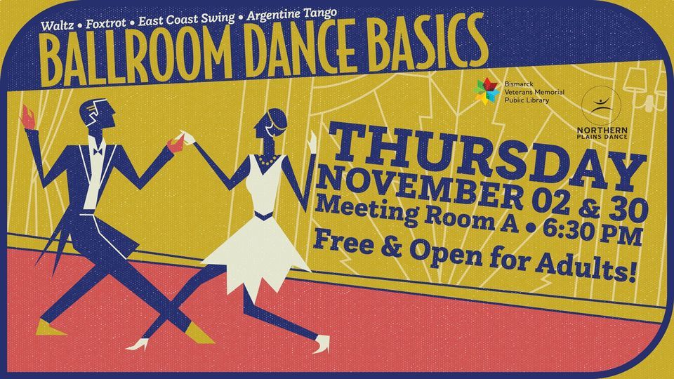 We are inviting all social dance lovers! Whether you are a seasoned pro or a complete beginner, we invite you to join us for an evening of fun and excitement at Ballroom Basics. Our experienced instructor from Northern Plains Dance will guide you step-by-step through the fundamentals of “lead and follow,” “basic footwork patterns,” and musicality in various popular dance styles, including Waltz, Foxtrot, East Coast Swing, Salsa, and Argentine Tango.Imagine yourself confidently gliding across the dance floor, feeling the rhythm of the music and the connection with others. It is very exhilarating! Ballroom dancing is a great way to relieve stress, boost your mood, and stay active. It is also a fun and social activity you can enjoy with friends, family, or strangers. So come on and join us for Ballroom Basics! No partner is needed either! We’ll see you on the dance floor!