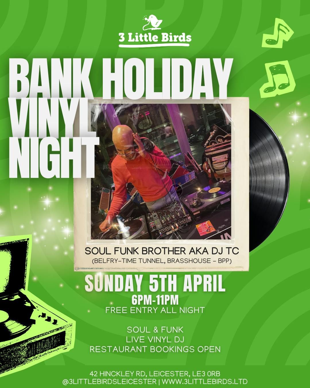 ๐ค VINYL NIGHT โ THIRD YEAR RUNNING! ๐ค๐Head down to 3 Little Birds for a full night of Soul & Funk โ strictly vinyl only โจReal records. Real grooves. Real vibes.๐๐น Add in great food, cold drinks, and a special guest set from๐ง DJ Soul Funk Brother (DJ TC) โ bringing serious heat after rocking spots like Belfry, Time Tunnel, Brasshouse & BPP.Expect non-stop feel-good classics all night long ๐ถ๐ฅ๐จ FREE ENTRY ALL NIGHT ๐จ๐๏ธ Book your free ticket early to avoid disappointment!Disclaimer: