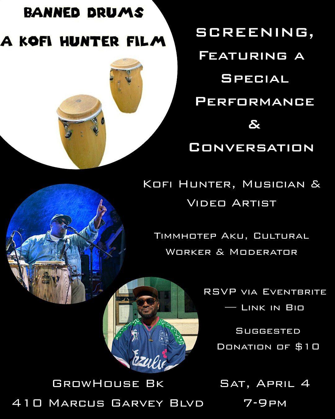 Join us for a night dedicated to the drum! Kofi Hunter will be screening his work-in-progress Banned Drums, a video work exploring the history of the drum as a tool of Black culture and its continued oppression inside of the settler-colonial project. Additonally, Hunter will be sharing a special performance beforehand, and following the screening will be in conversation with cultural worker and moderator Timmhotep Aku.