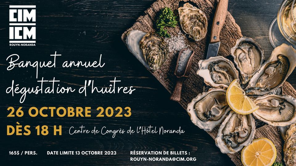 L’Institut canadien des mines, de la métallurgie et du pétrole (ICM), section Rouyn-Noranda vous invite cordialement à son banquet annuel de dégustation d’huîtres, le jeudi 26 octobre 2023, au Centre de Congrès de l’Hôtel Noranda, à partir de 18h00.