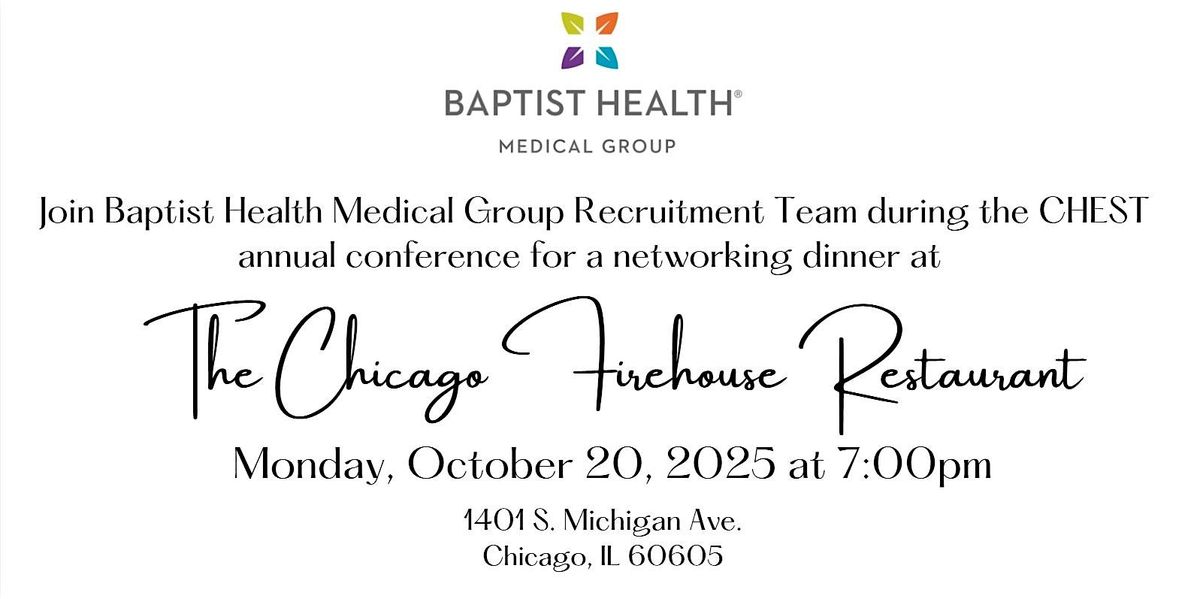 Join Baptist Health Medical Group's recruitment team at the Chicago Firehouse Restaurant for dinner and networking during the CHEST annual conference.