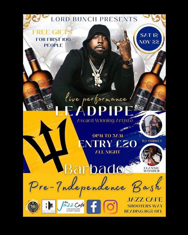 Barbados Pre-Independence Bash’ at Jazz Cafe, Reading on Sat 12 Nov 2022.