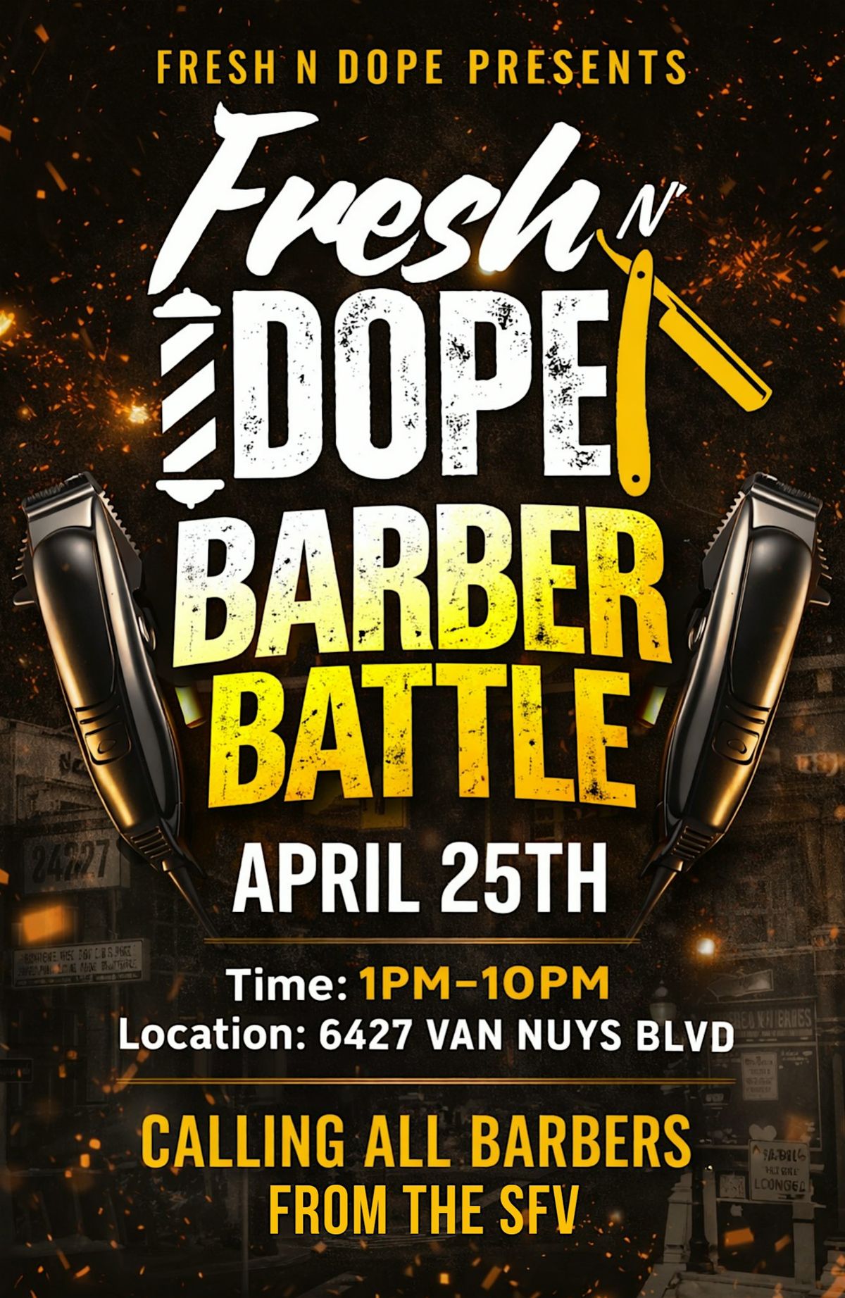 Join us in person for an epic showdown where the sharpest scissors and coolest styles take the spotlight. Whether you're a pro barber or just love fresh fades, this is the place to be for all things grooming. Expect fierce competition, creative vibes, and plenty of opportunities to connect with fellow hair enthusiasts. Don’t miss out on the action-packed day of style and swagger at the Barber Battle!