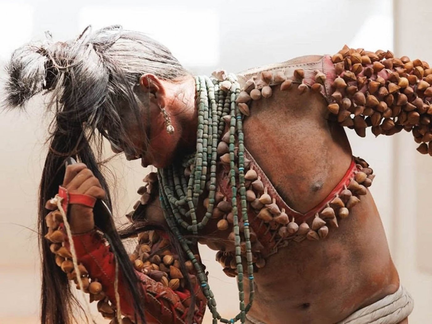 Lukas Avendaño moves within a ritual landscape of feathers, metallic paper, gold, silver, and ayoyotes, ancestral seeds that rattle with each step, summoning the sensual and the sacred in equal measure. Through movement, sound, and adornment, ash emerges as a polysemic ritual element unfolding in metaphors—a quintessential symbol of scorched earth, and of the survivors who rise from the ashes of their own bodies. Bardaje becomes a living archaeology of memory and matrilineality, where identity resists containment and vibrates through body and lineage. Neither confession nor spectacle, Bardaje is an embodied meditation on muxheidad: a third gender that defies translation and insists on its own cosmology of beauty, vitality, and becoming.