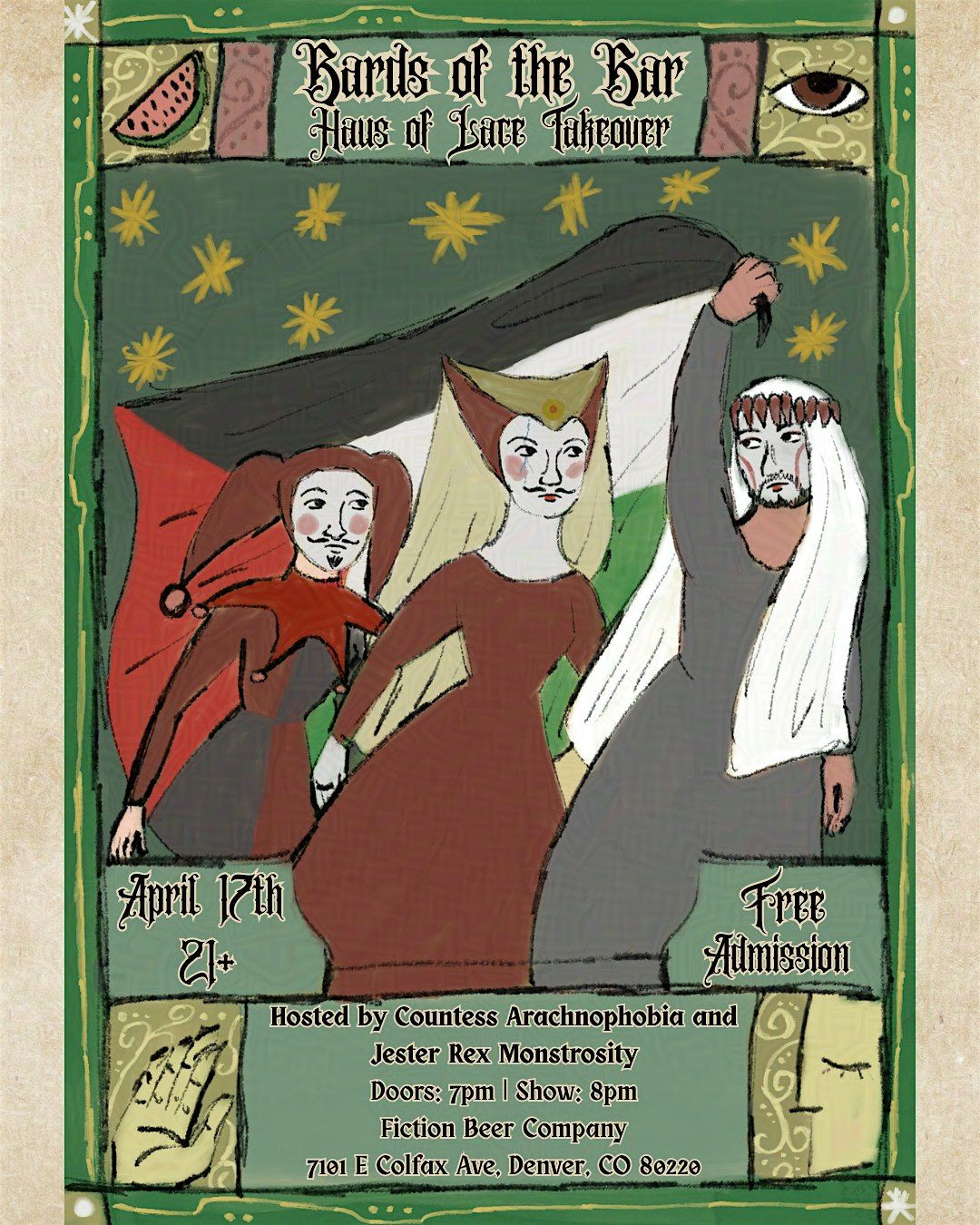 Hear ye, hear ye! Bards of the Bar has returned to Fiction Beer Co., hosted by Countess Arachnophobia and her court jester Rex Monstrosity! The Haus of Lace is joining us for a charity show, with all tips going directly to the Palestinian Children's Relief Fund. Join us for a night of fundraising, ren faire goodness, and, of course, DRAG!