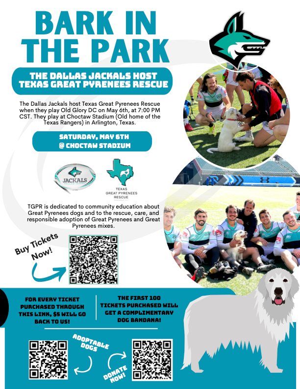 The Dallas Jackals host Texas Great Pyrenees Rescue when they play Old Glory DC on May 6th, at 7pm. They play at the Choctaw Stadium in Arlington. For every ticket purchased through this link, $5 will go back to TGPR so we can help even more pyrs in need. The first 100 tickets sold will get a complimentary dog bandana!https://offer.fevo.com/old-glory-dc-nmuf8cv-e838984?fevoUri=old-glory-dc-nmuf8cv-e838984%2F