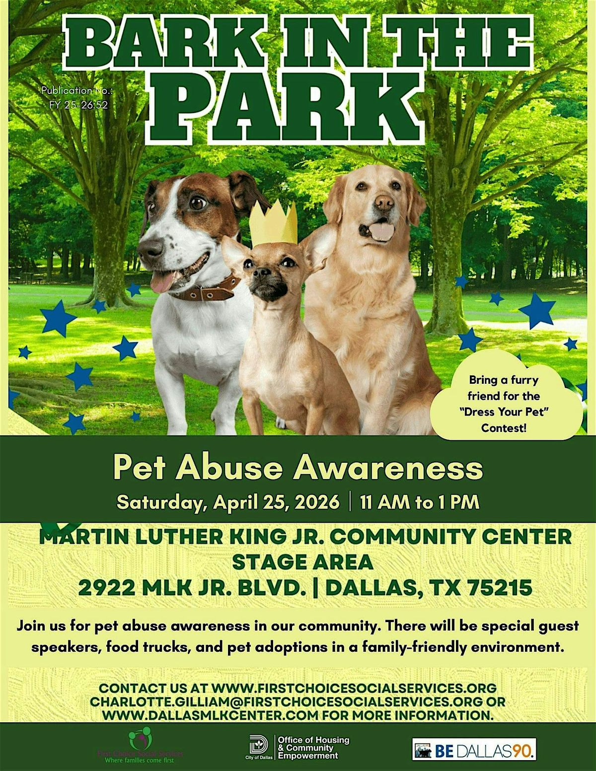 Join us as we explore the intersection between pet abuse and domestic violence. We will have guest speakers, food trucks, and pet adoptions in a family-friendly environment. Bring a furry friend for the "Dress Your Pet" Contest.