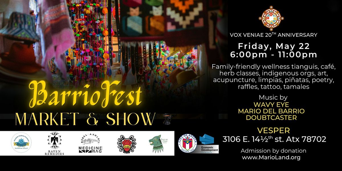 Celebrate two decades of community at the BarrioFest, a family-friendly wellness tianguis honoring the 20th anniversary of Vox Veniae with traditional healing, live music, and a bustling marketplace featuring local authors, poets, indigenous organizations, and Austin’s vibrant cultural workers.