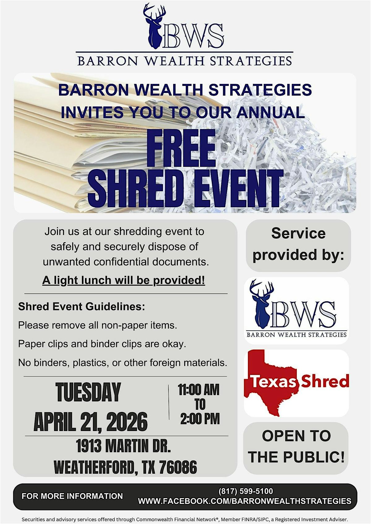 Barron Wealth Strategies is hosting its annual FREE Shred Event on April 21st from 11:00 AM – 2:00 PM!