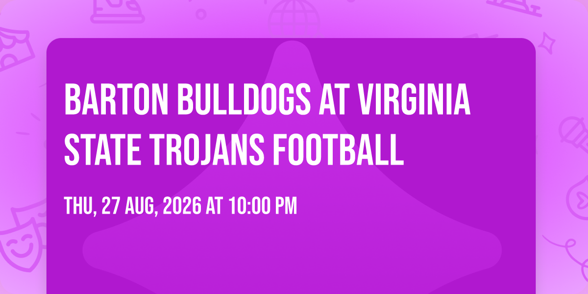 π Location: 37.2401, -77.4259π Prepare to be amazed at Barton Bulldogs at Virginia State Trojans Football, the most anticipated gathering of the season! π Set against the stunning backdrop of Rogers Stadium - Petersburg in vibrant Petersburg, VA, this event promises to redefine your expectations. π Mark your calendars for August 27th, 2026 at 10:00 PM and get ready to immerse yourself in an atmosphere of wonder and excitement. β¨ From the moment you arrive, you'll be transported into a world where memories are made and stories come alive. They have crafted an experience that perfectly harmonizes entertainment, innovation, and community spirit. π Join us as we create moments that will be discussed for years!