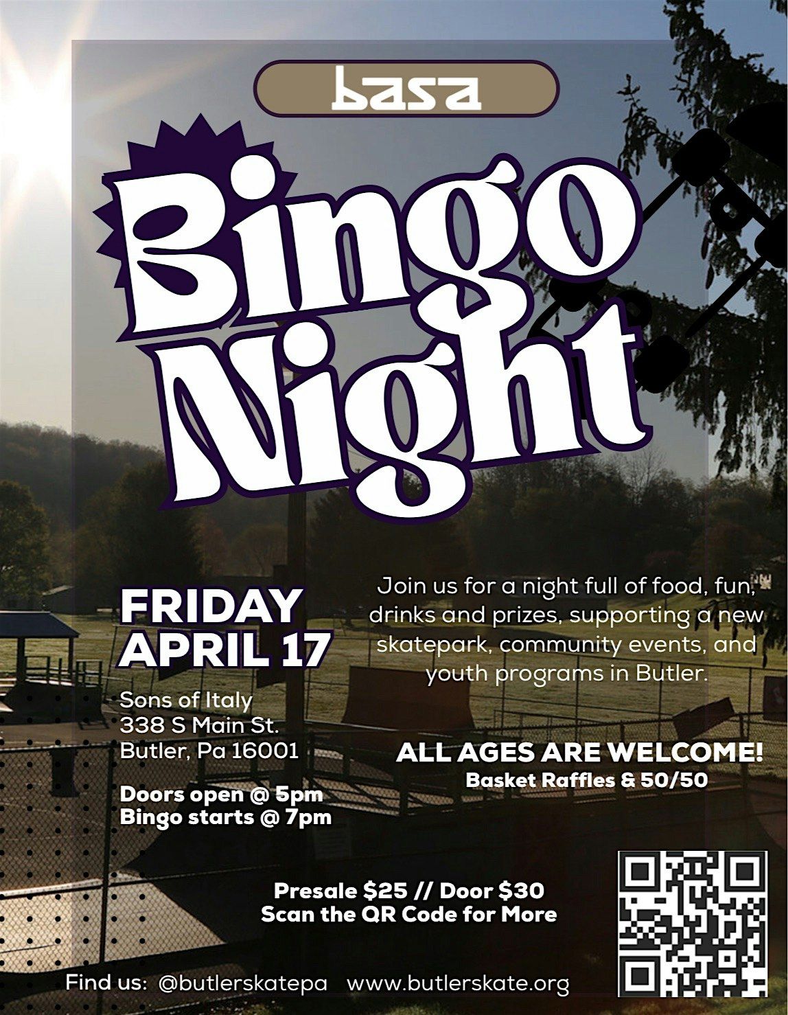 Join the Butler Area Skatepark Association for a fun night of bingo, prizes, food, and community as we raise funds to support skateboarding in Butler.