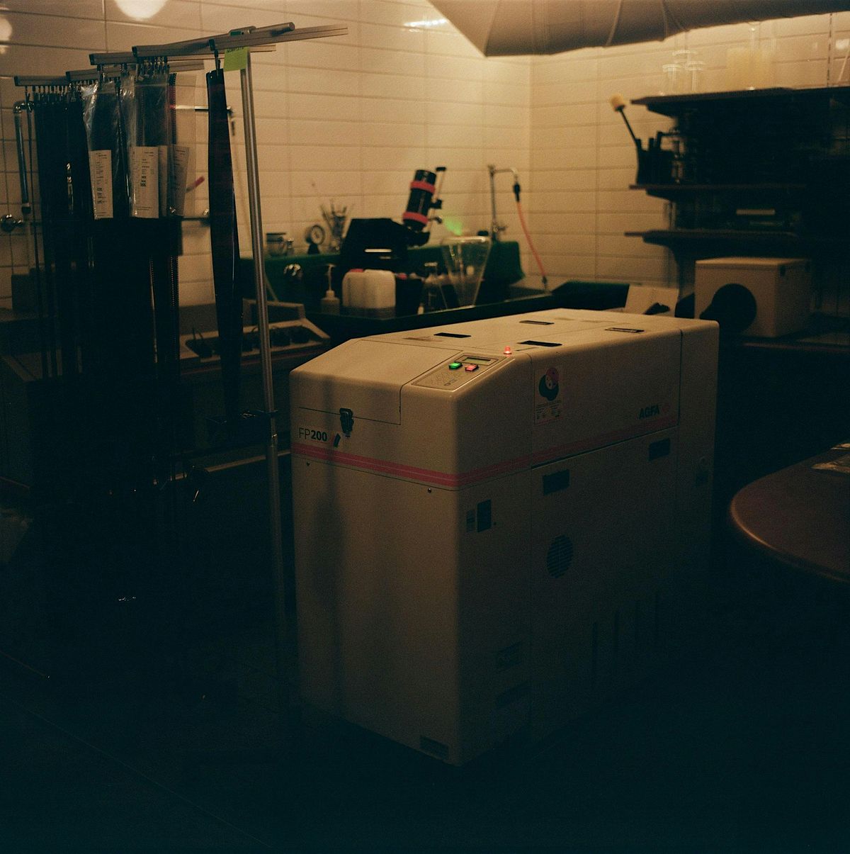 Students will process their film using a professional mini-lab processor, the same type of machine used in drugstores and photo counters throughout the 1990s. The processor automatically controls temperature, chemistry, and agitation—producing fully developed and dried film in about nine minutes.
