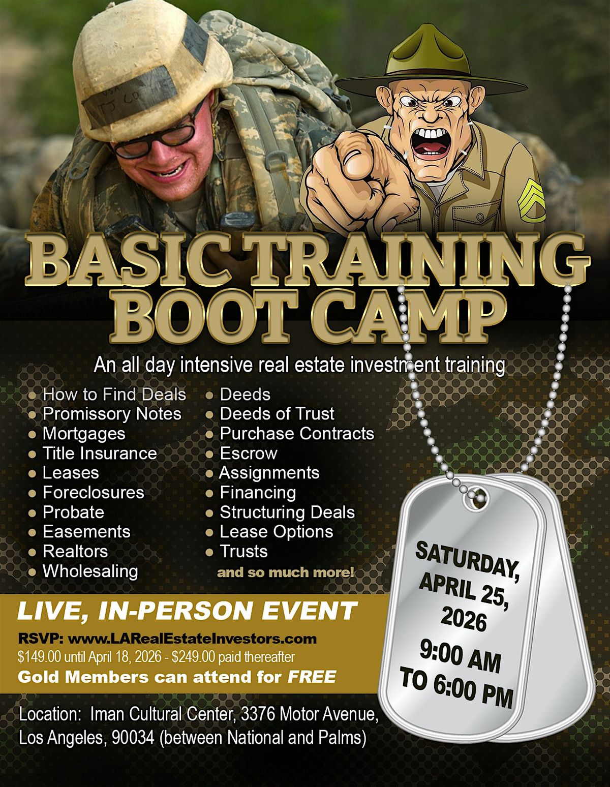 Our Boot Camp is scheduled for Saturday, April 25, 2026, 9:00 am to 6:00 pm. If you've been dreaming of becoming a real estate investor, but didn't know how to get started, this Basic Training Boot Camp is for you! This Boot Camp is hosted by the Los Angeles County Real Estate Investors Association and the Ventura County Real Estate Investors Association.