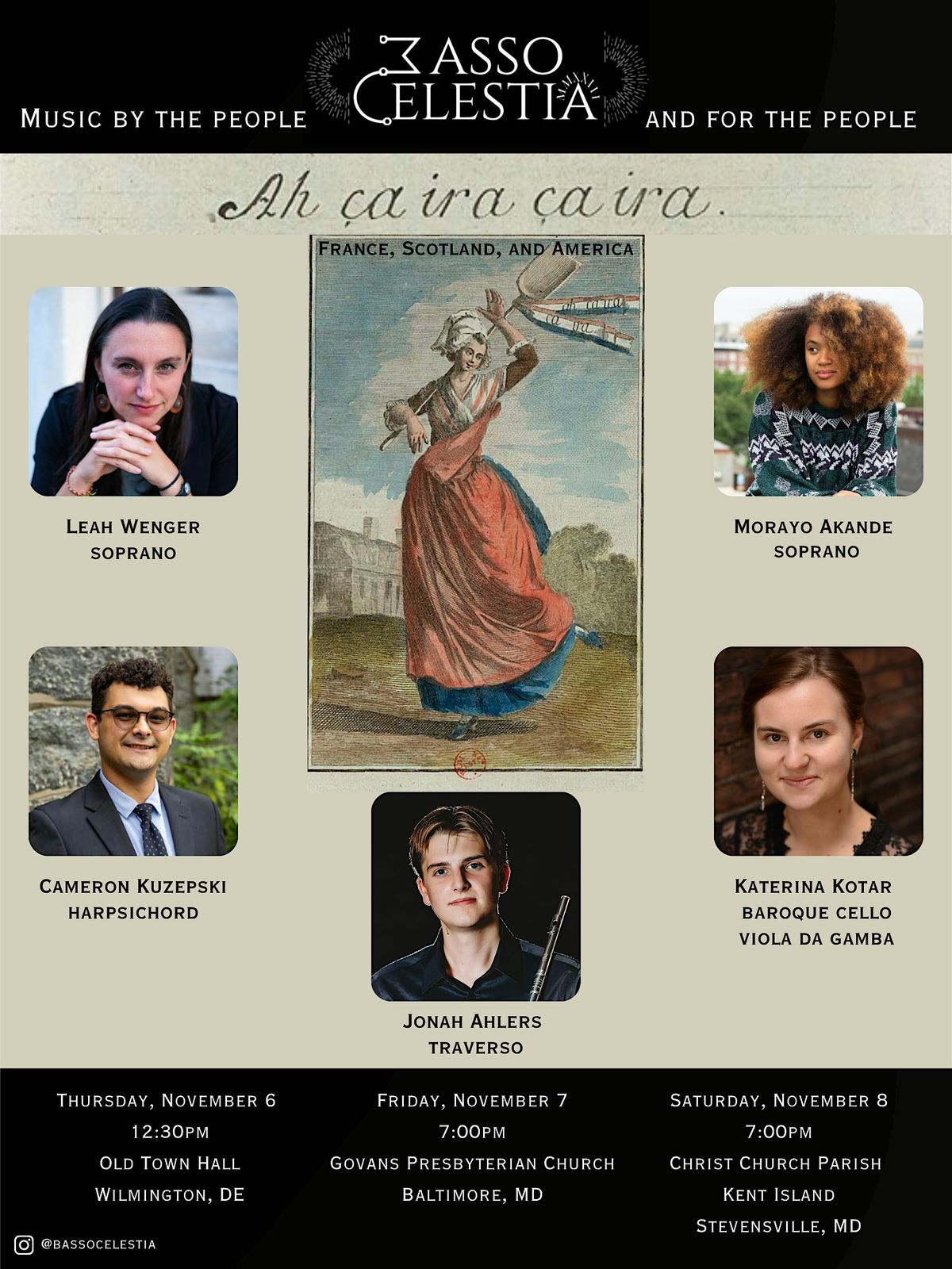 Basso Celestia presents “Ah, Ça Ira” (“It’ll be alright!”), a program structured around the pursuit of liberty in a period marked by resistance, rebellion, and revolution. Three revolutions were key to shaping the late eighteenth century: the Jacobite rising (1745-1746), the American Revolution (1775-1783), and the French Revolution (1789-1799). Featuring music from France, Scotland, and early America, this program is a testament to the many roles that music played in this period of change, from direct calls to action, to folk music preserving a sense of home, to telling tales carried back across the sea.