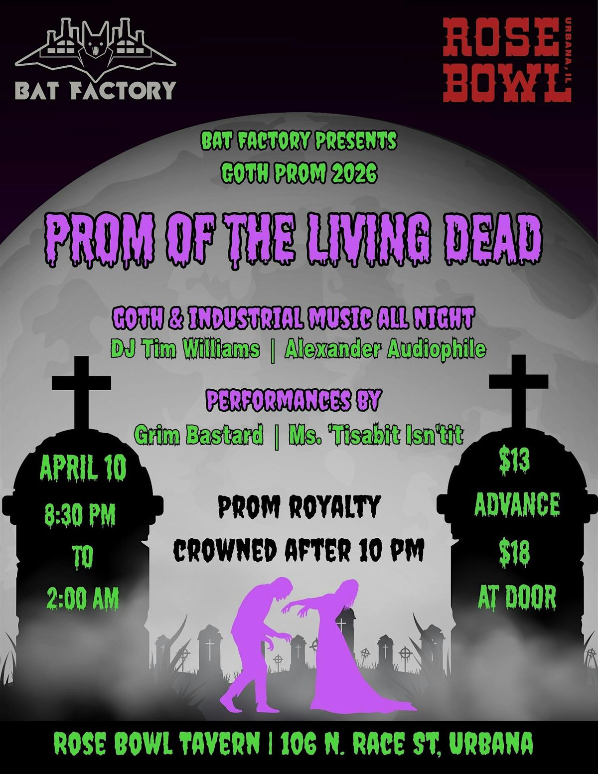 On April 10th it's time to unbury yourself from the sludge and shamble to the Rose Bowl in Urbana for our most ghoulish Goth Prom. Whether you shuffle, lurch, or crawl, there'll be room on the dance floor, with goth and industrial music playing all night long.