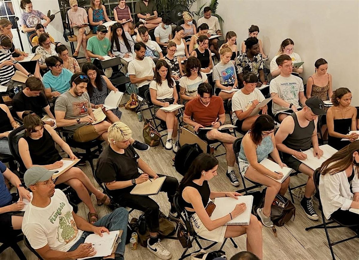 Seating is first come, first served, and we start right at 7pm with quick poses to loosen up. As the night goes on, we move into longer poses so you can settle in and create at your own pace.