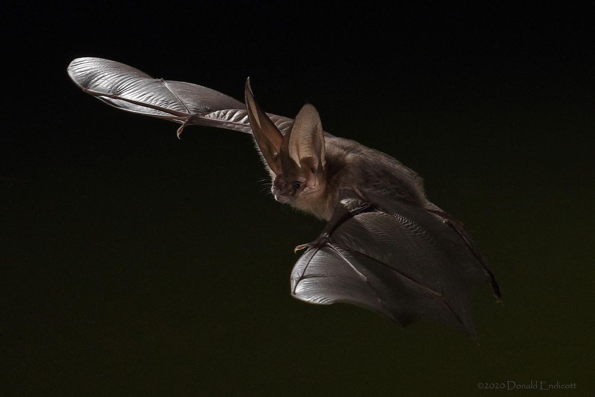 Photo: Townsend's big-eared bat (Corynorhinus townsendii) in flight after drinking from a small stock trough in the Laguna Mountains east of San Diego