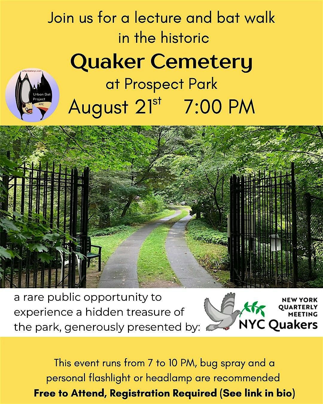 NYC Friends and others are welcome at a “Bats 101” presentation in the Quaker (Friends) Cemetery followed by bat spotting at the nearby Peninsula area of Prospect Park. This event will be led by Nic Comparato (they/them, IG: @lesscommonloons), a wildlife biologist with NYC Bird Alliance and a PhD student with the Aronson Lab for Urban Ecological Studies at Rutgers University. Nic is a specialist in the recording and analysis of bat sonar. Their Urban Bat Project NYC is on IG: @urbanbatsnyc.