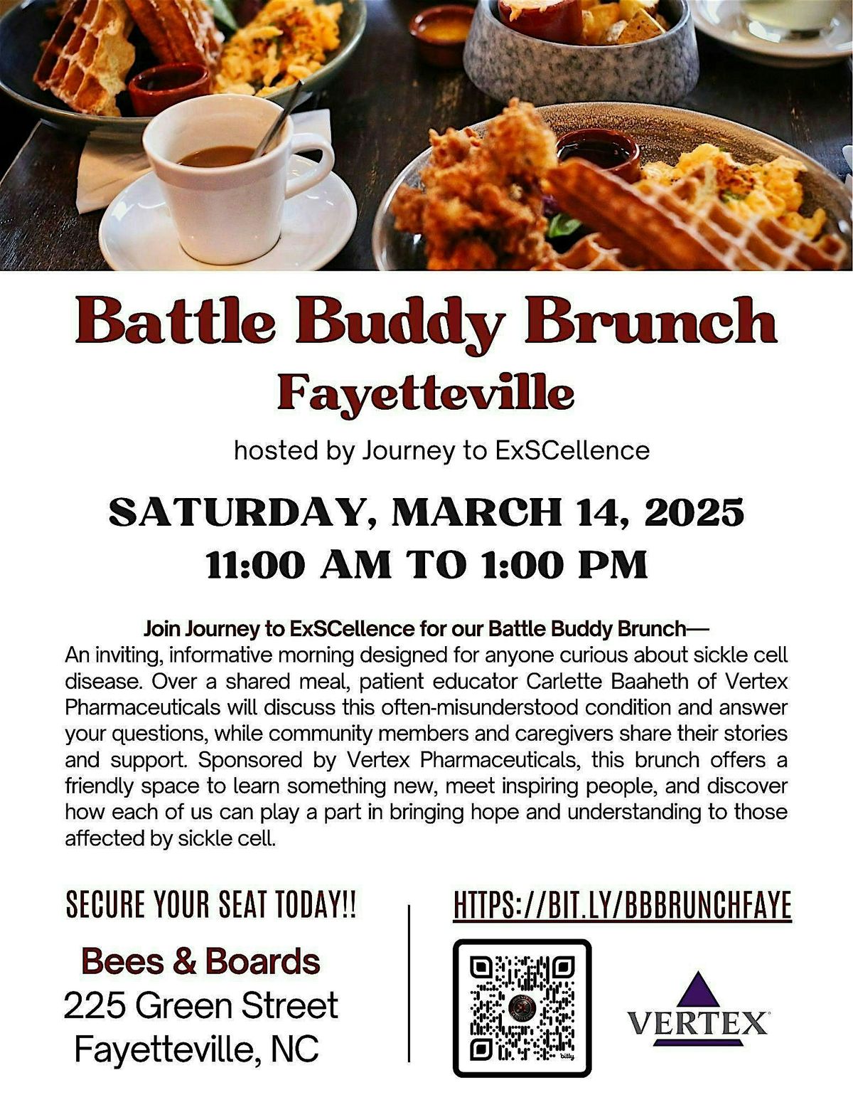 Over a shared meal, patient educator Carlette Baaheth of Vertex Pharmaceuticals will discuss this often‑misunderstood condition and answer your questions, while community members and caregivers share their stories and support. Sponsored by Vertex Pharmaceuticals, this brunch offers a friendly space to learn something new, meet inspiring people, and discover how each of us can play a part in bringing hope and understanding to those affected by sickle cell.
