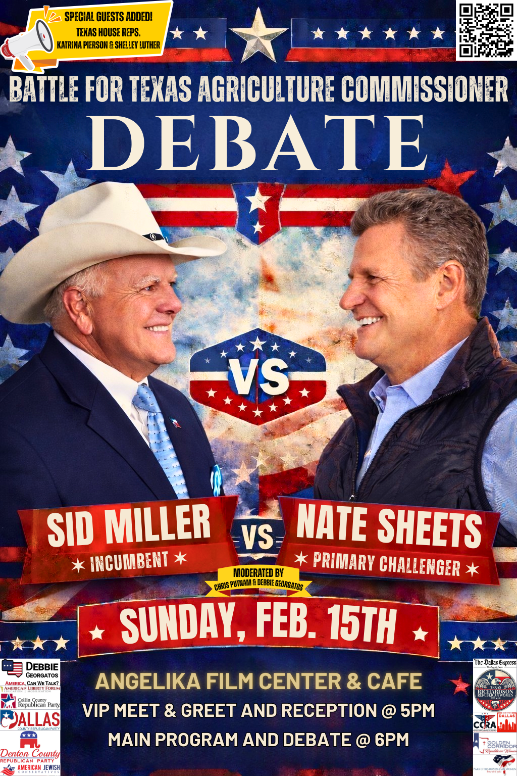 On Sunday, February 15th, join us at the iconic Angelika Film Center & Cafe for a head-to-head showdown in the race for Texas Agriculture Commissioner. Incumbent Sid Miller faces primary challenger Nate Sheets in a live, in-person debate that will shape the future of Texas agriculture and conservative leadership statewide.