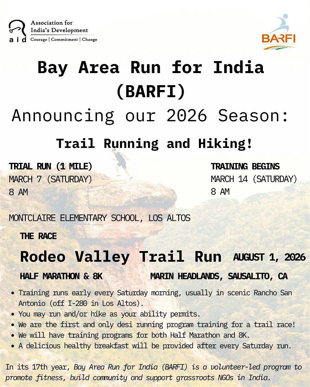 AID Bay Area's Run for India (BARFI) program provides 4 months' training from March through the summer – this year, we will be training for the scenic Rodeo Valley Trail Run on August 1. The training is provided by experienced coaches and runners and participation needs no prior running experience.