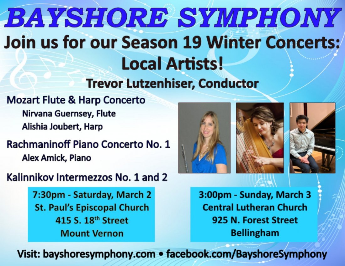 The Bayshore Symphony's winter concerts are fast approaching. We're featuring three local artists at our concerts: Nirvana Guernsey and Alishia Joubert performing Mozart's Flute & Harp Concerto as well as pianist Alex Amick playing Rachmaninoff's Piano Concerto #1. Come and show them your support! We're also playing two delightful Intermezzos by Kalinnikov. Trevor Lutzenhiser conducting.