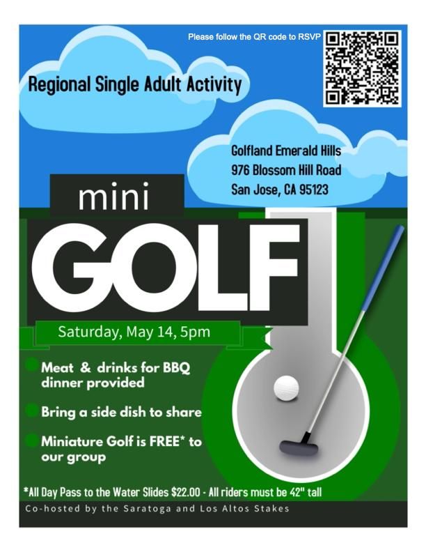 Come enjoy a BBQ dinner and play mini golf and make new friends! RSVP https://tinyurl.com/2p8dkxs2