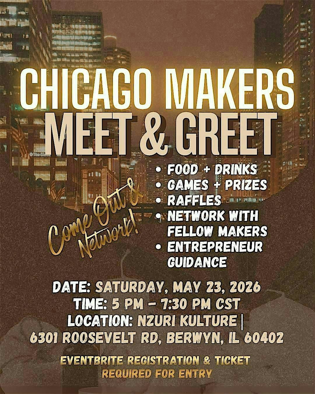 Join us for a fun and casual meet & greet at 6301 Roosevelt Rd! This is a great chance to connect with fellow makers, share ideas, and get inspired. Mark your calendar for May 23, 2026 at 5:00 PM (Central Time). Whether you're a pro or just curious, everyone’s welcome. Don’t miss out on meeting cool people and sparking creativity in the heart of Chicago!
