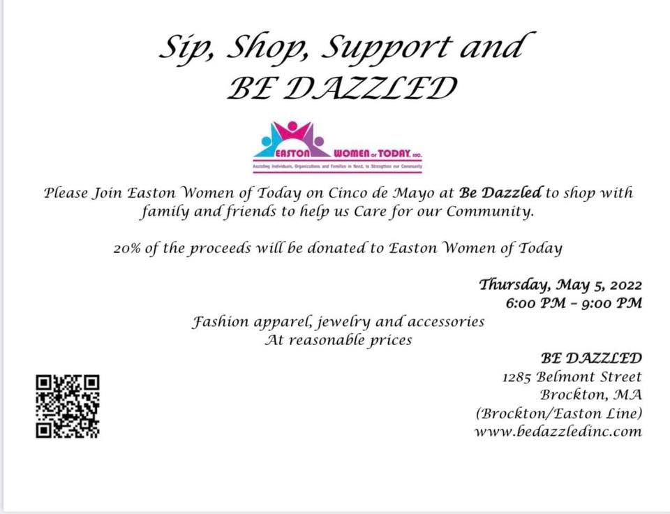 Please join Easton Women of Today to sip, shop and support a local business while helping us Care for our Community. 20% of the sales from this event will be donated to Easton Women of Today. Fashion apparel, jewelry and accessories at reasonable prices.