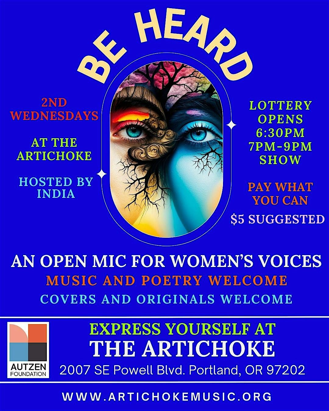 Be Heard is an open mic for women’s voices. Music and poetry welcome. Covers and originals welcome. Put your name in the hat starting at 6:30pm for a lottery, which closes at 6:50pm. Show starts at 7pm and goes until 9pm. Each performer gets 5 minutes or one piece on stage. We move things along to make sure everyone gets a chance to play/ read and is not turned away. Come to share your song or story, or simply to listen and connect.