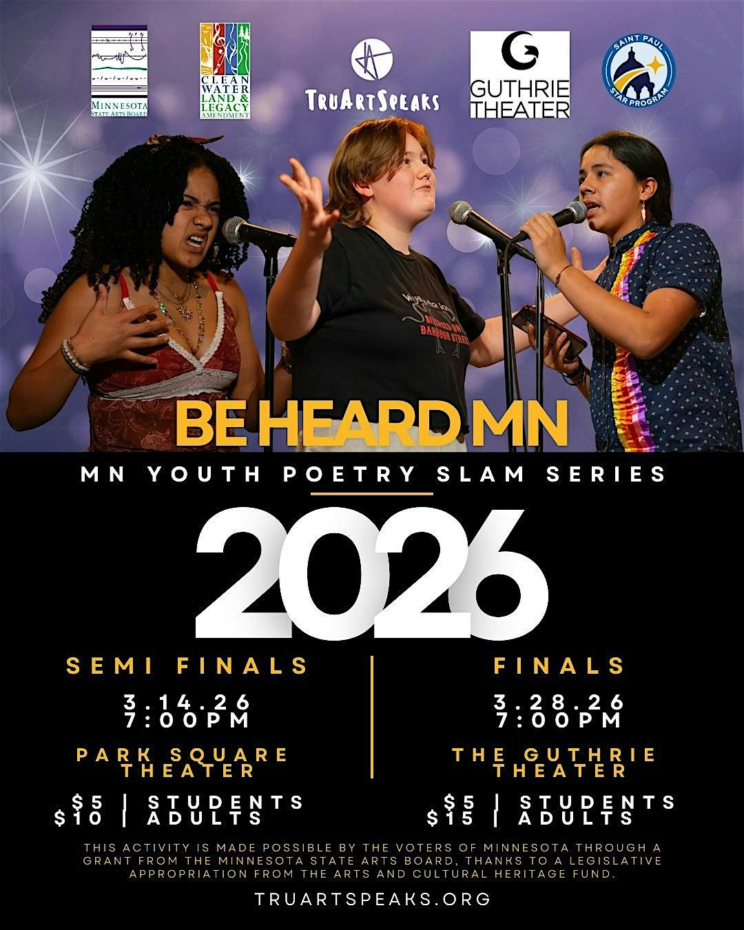 Poets from across the state have competed in SEVEN preliminary bouts, a youth writing conference, and more! All in an effort to make their way to onto the 2026 Be Heard Cohort, representing youth voice in Minnesota throughout the year. Get here; support the next generation of poets!